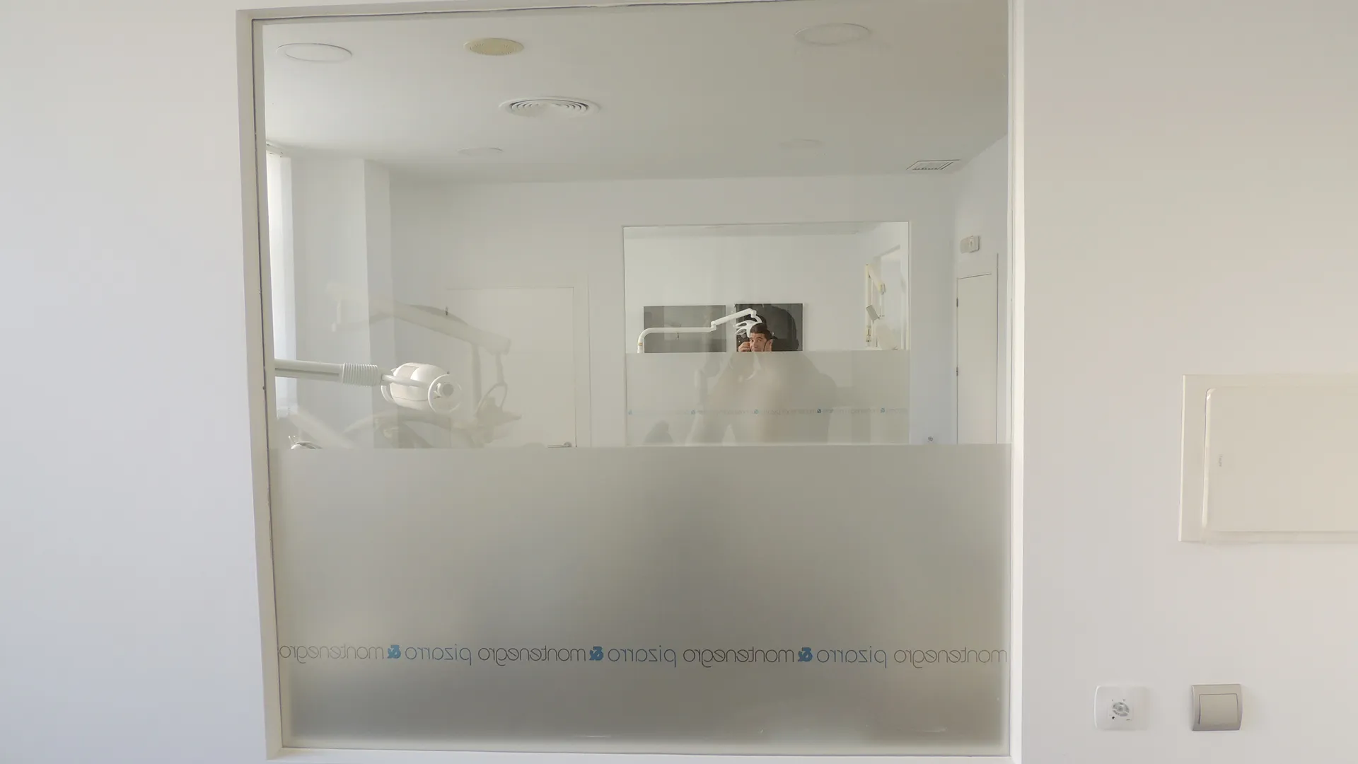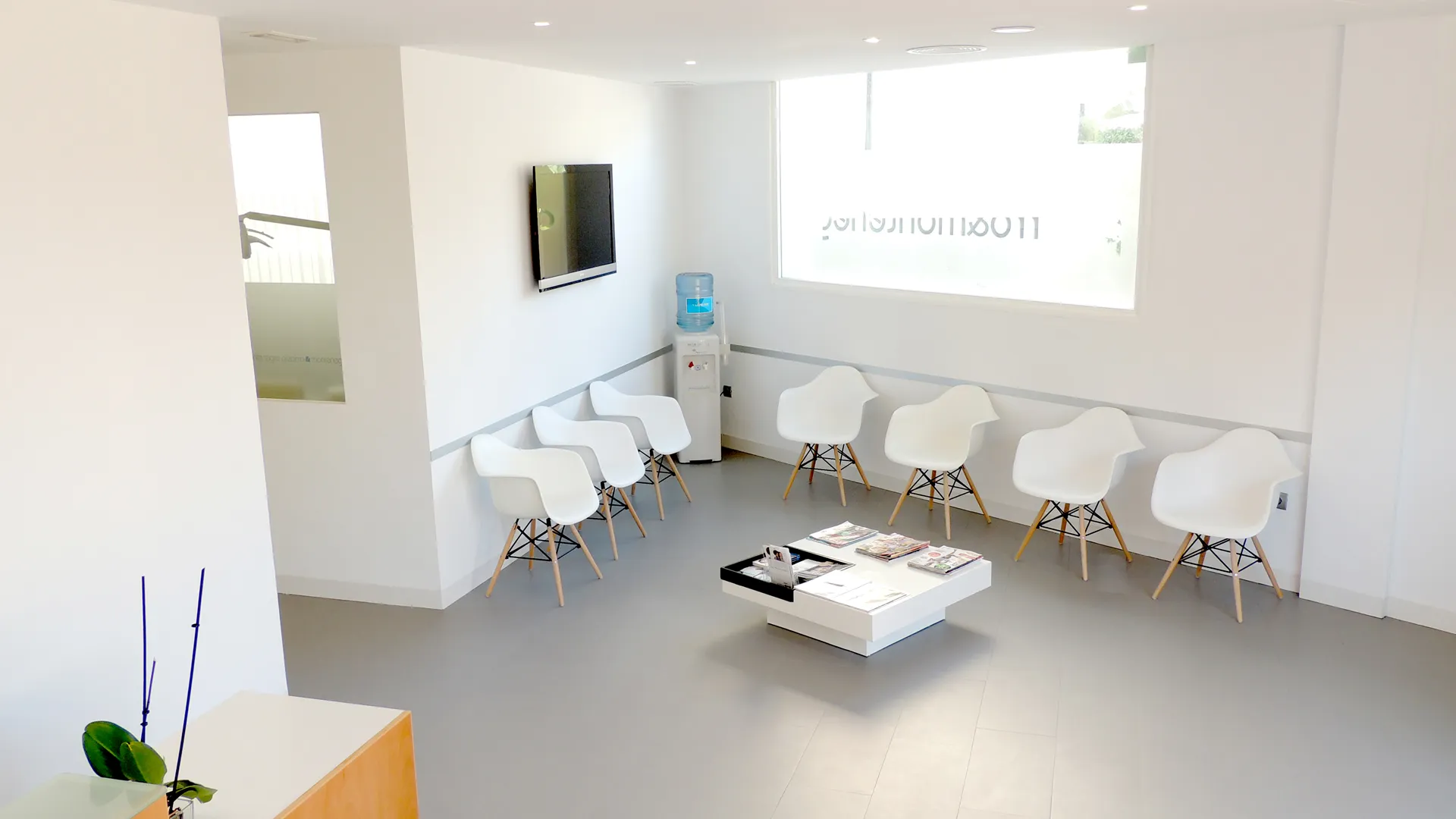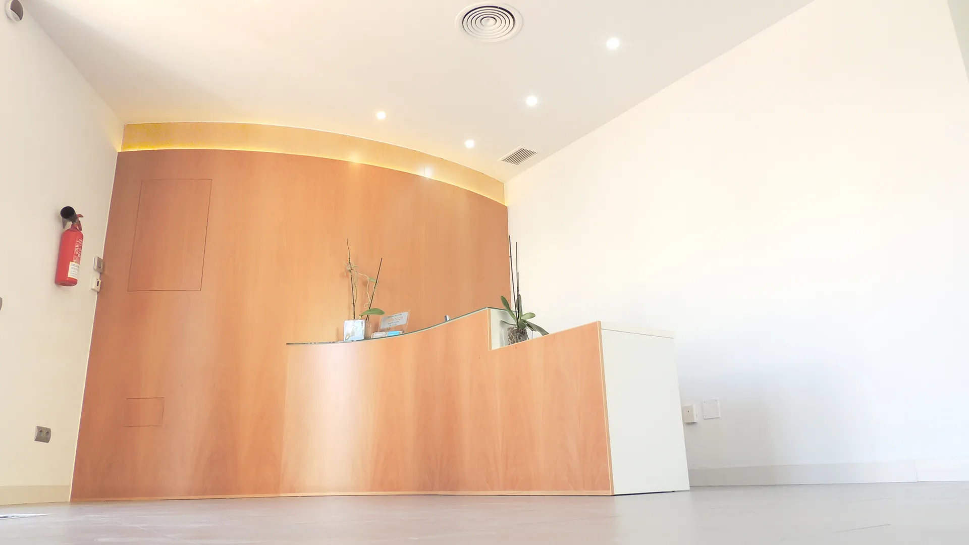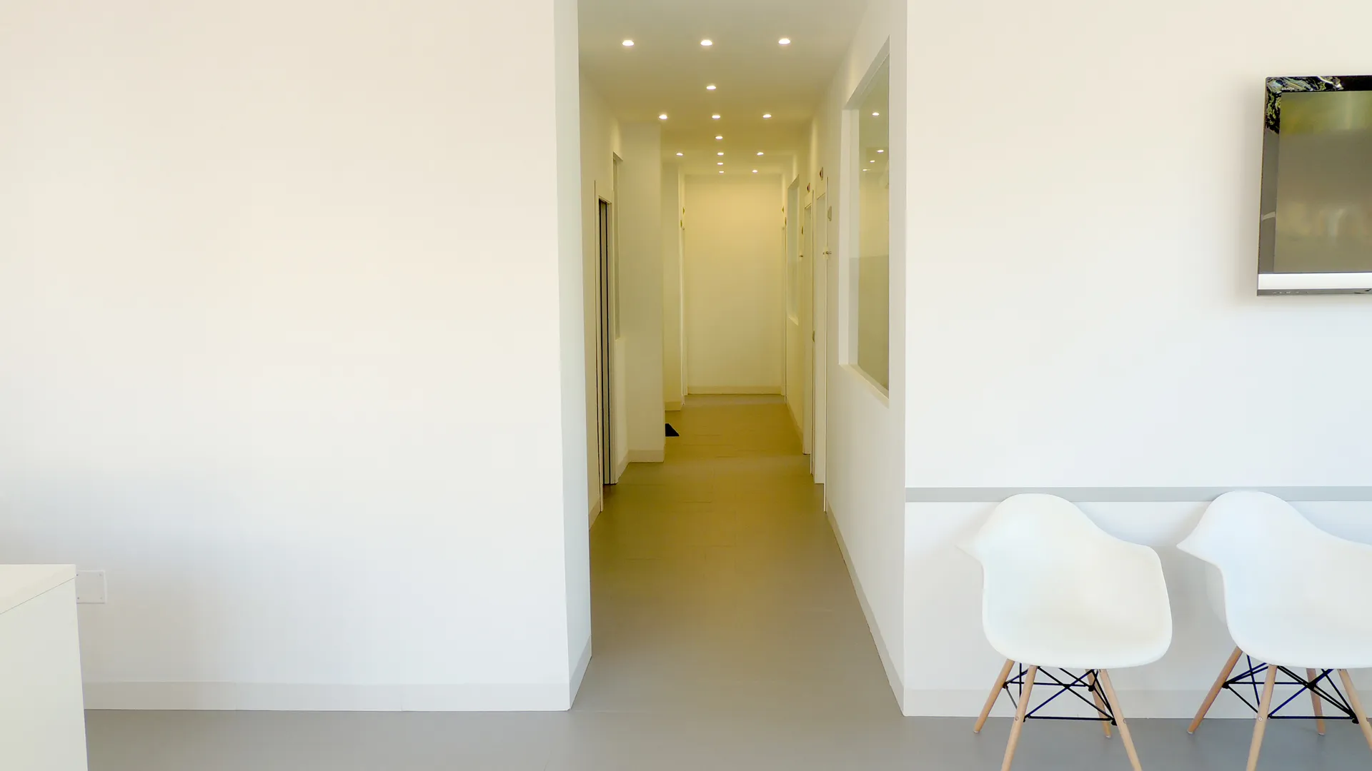 Clínica Dental Marbella Pizarro Montenegro. Diseño del espacio interior con líneas rectas, elementos puros y colores neutrales, “roto” por la recepción orgánica de madera que aporta calidez y da la bienvenida a los pacientes. Apertura de ventanas entre gabinetes y también en el corredor, para aportar más luz a los espacios interiores y a su vez, para quitar la sensación de encierro de los doctores, asistentes y clientes.
