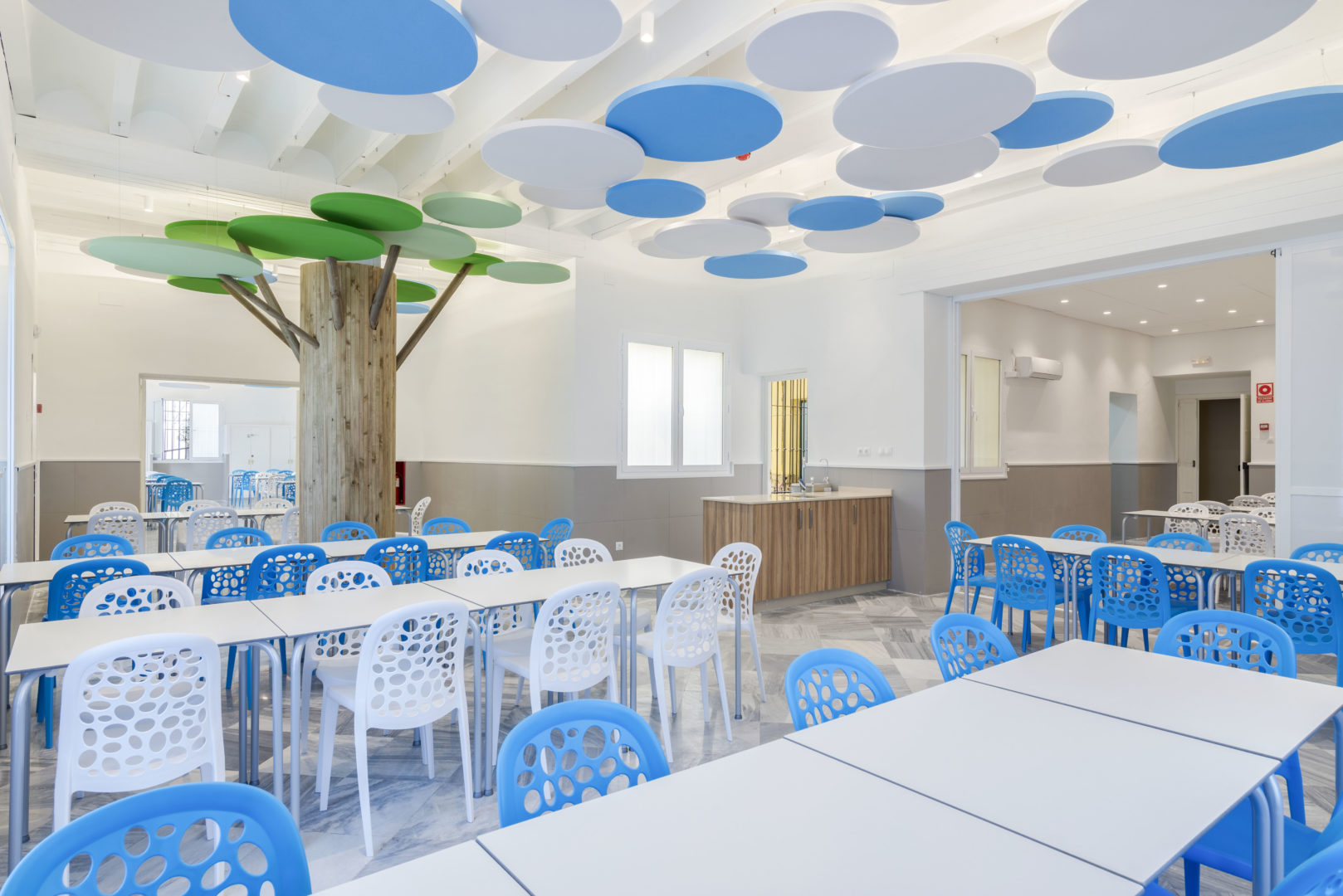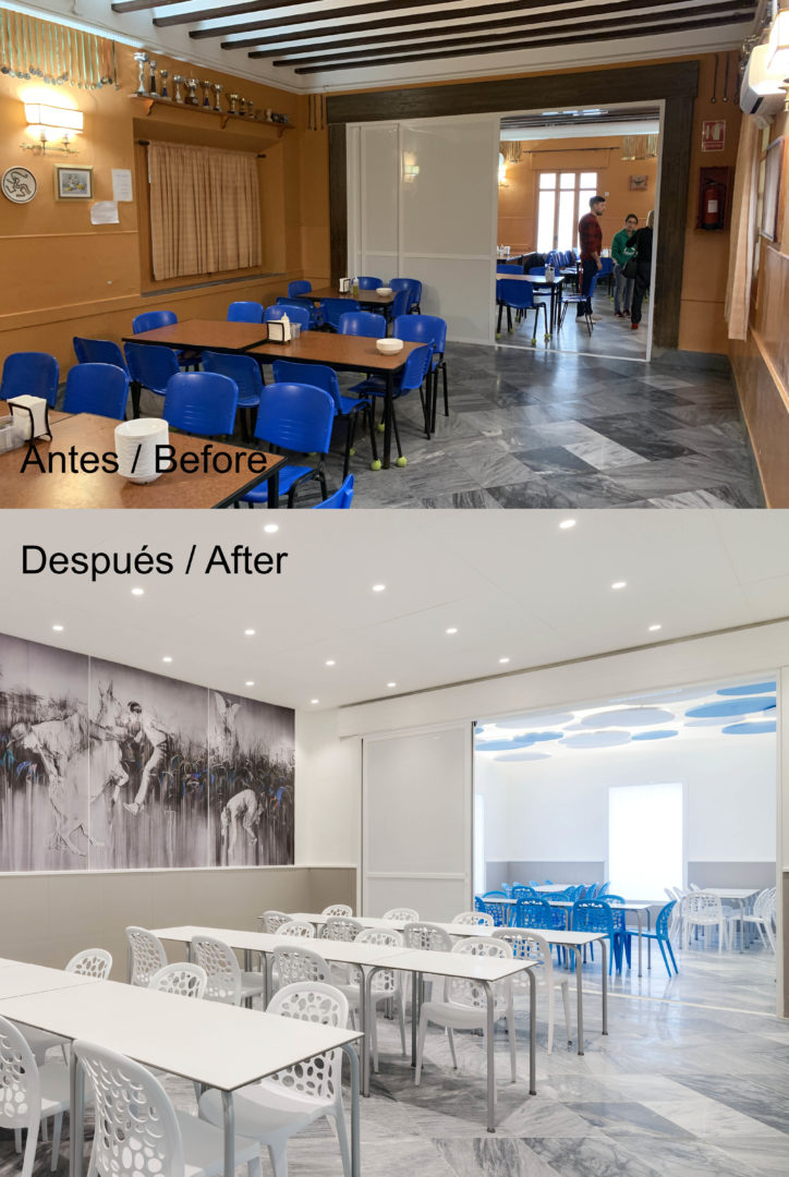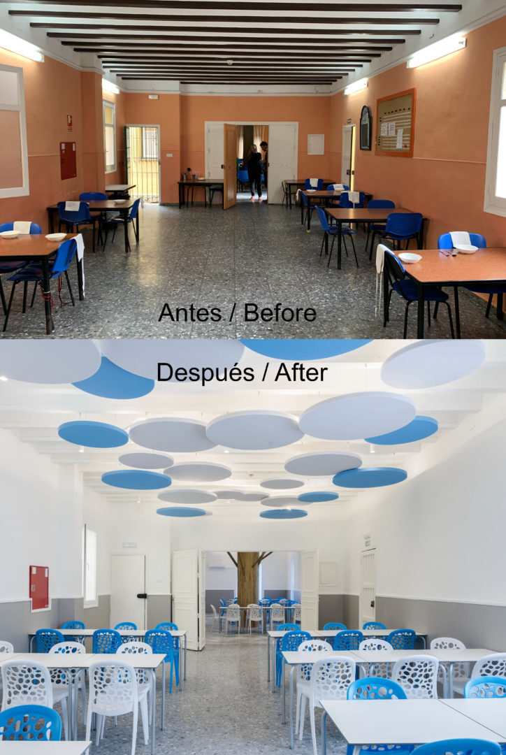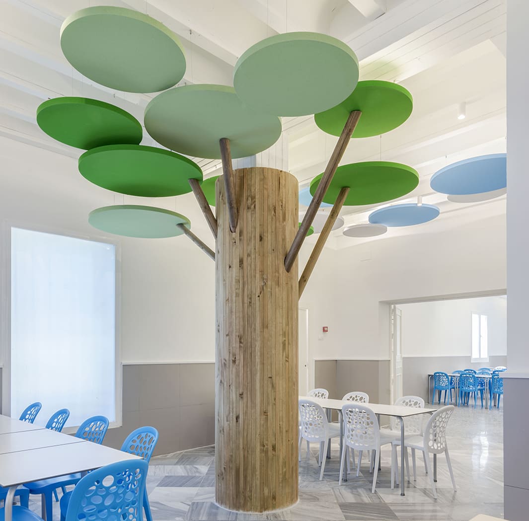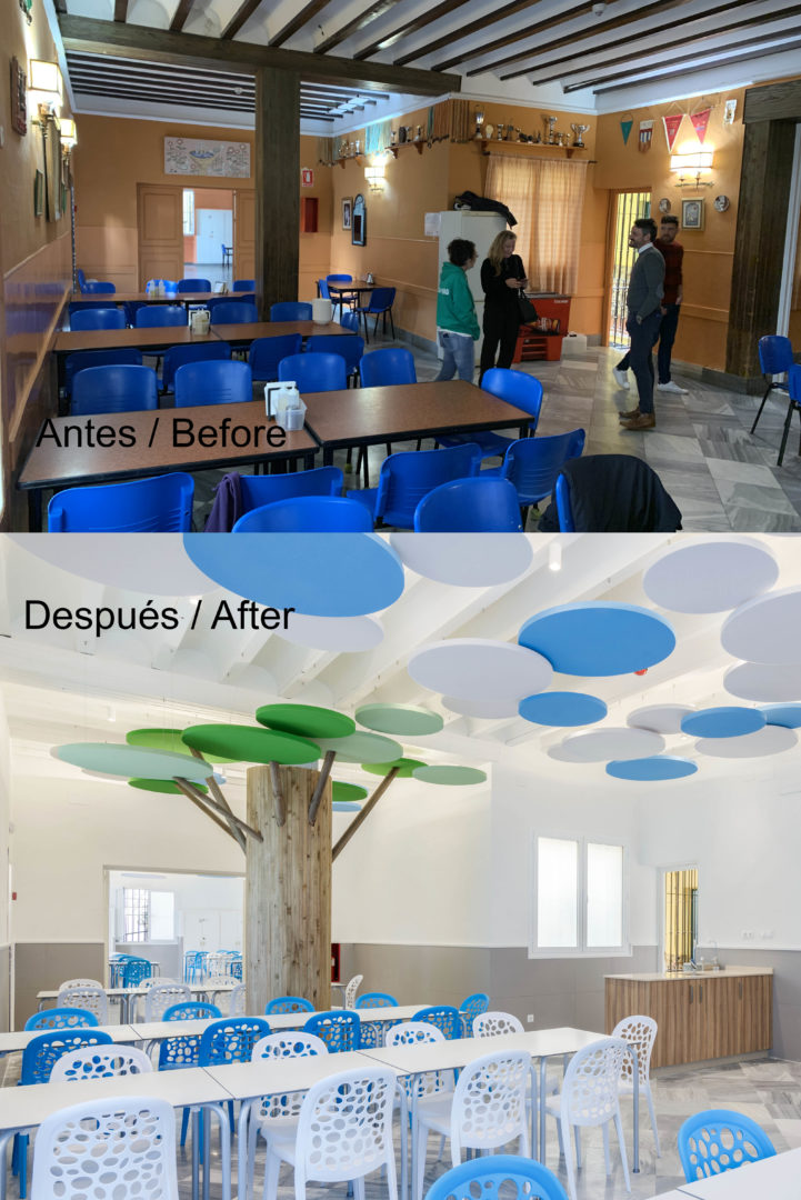 Proyecto de Interiorismo (obra benéfica) de reforma del comedor del Instituto Psicopedagógico «Dulce Nombre de María» en Málaga, que se ha proyectado como un espacio onírico y de fantasía, pensando en la alegría y amplitud del espacio que los niños necesitan, recreando un interior con árboles y nubes, para los que se han utilizado paneles fonoabsorbentes, que han resuelto los problemas acústicos que antes tenía, generando un espacio tranquilo pero divertido a la vez.