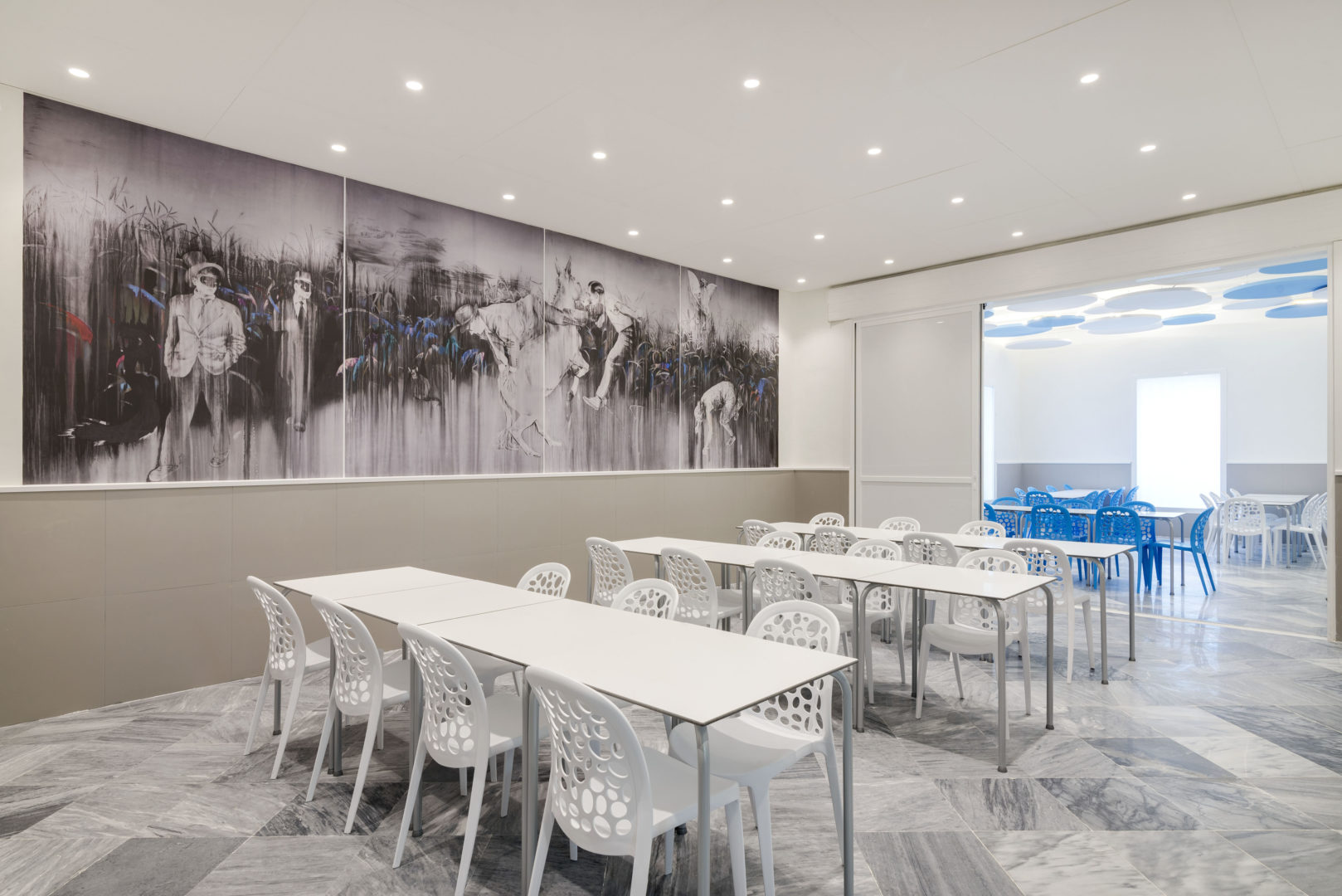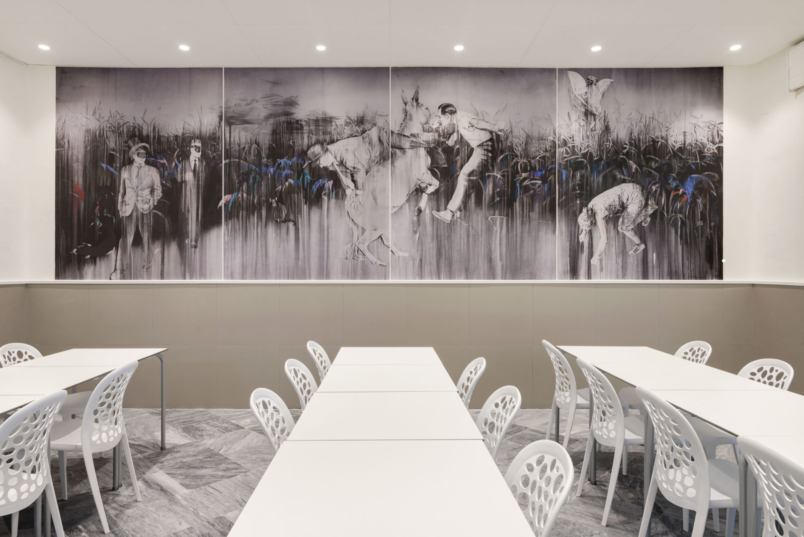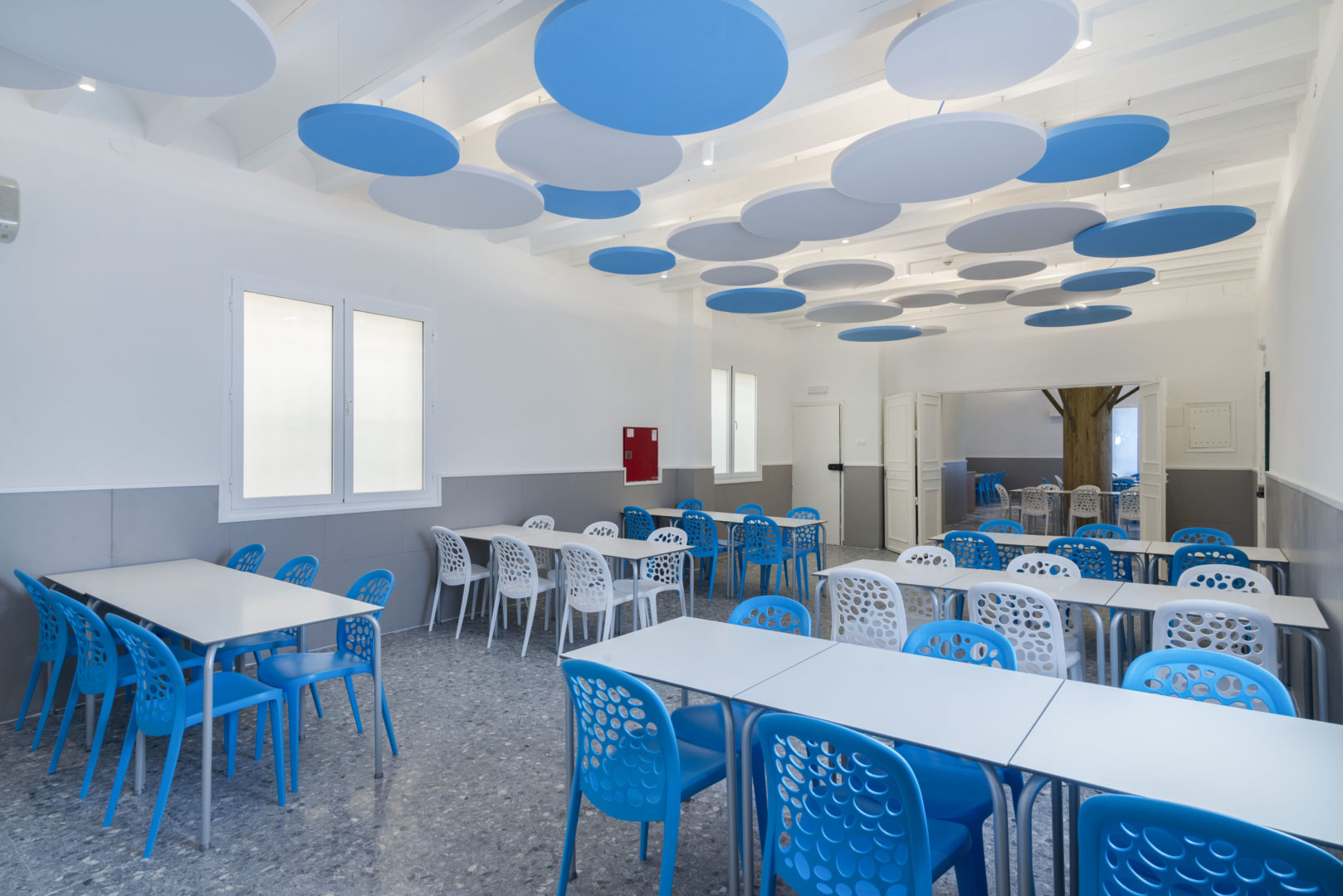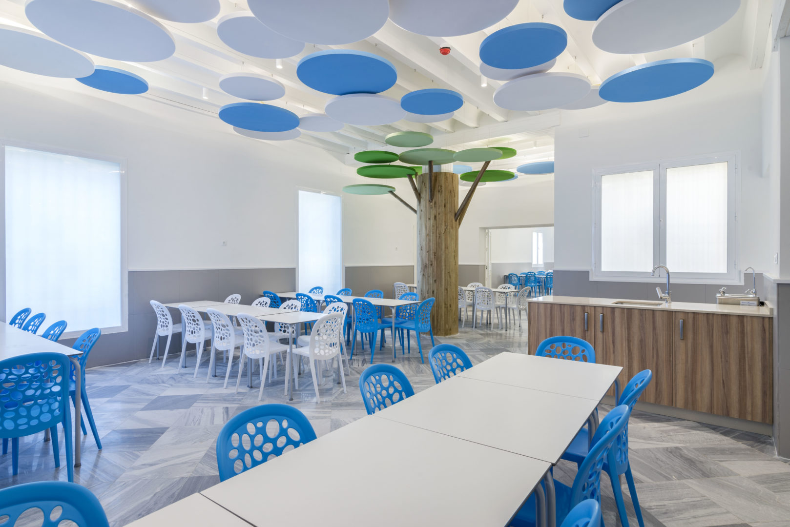 Proyecto de Interiorismo (obra benéfica) de reforma del comedor del Instituto Psicopedagógico «Dulce Nombre de María» en Málaga, que se ha proyectado como un espacio onírico y de fantasía, pensando en la alegría y amplitud del espacio que los niños necesitan, recreando un interior con árboles y nubes, para los que se han utilizado paneles fonoabsorbentes, que han resuelto los problemas acústicos que antes tenía, generando un espacio tranquilo pero divertido a la vez.