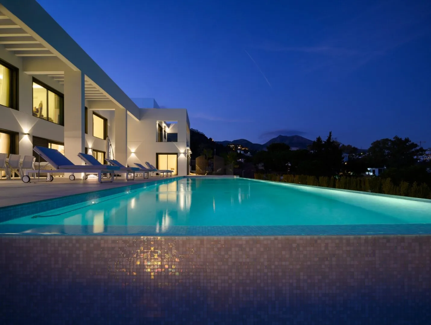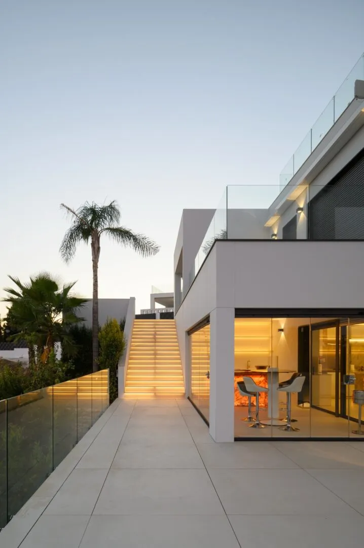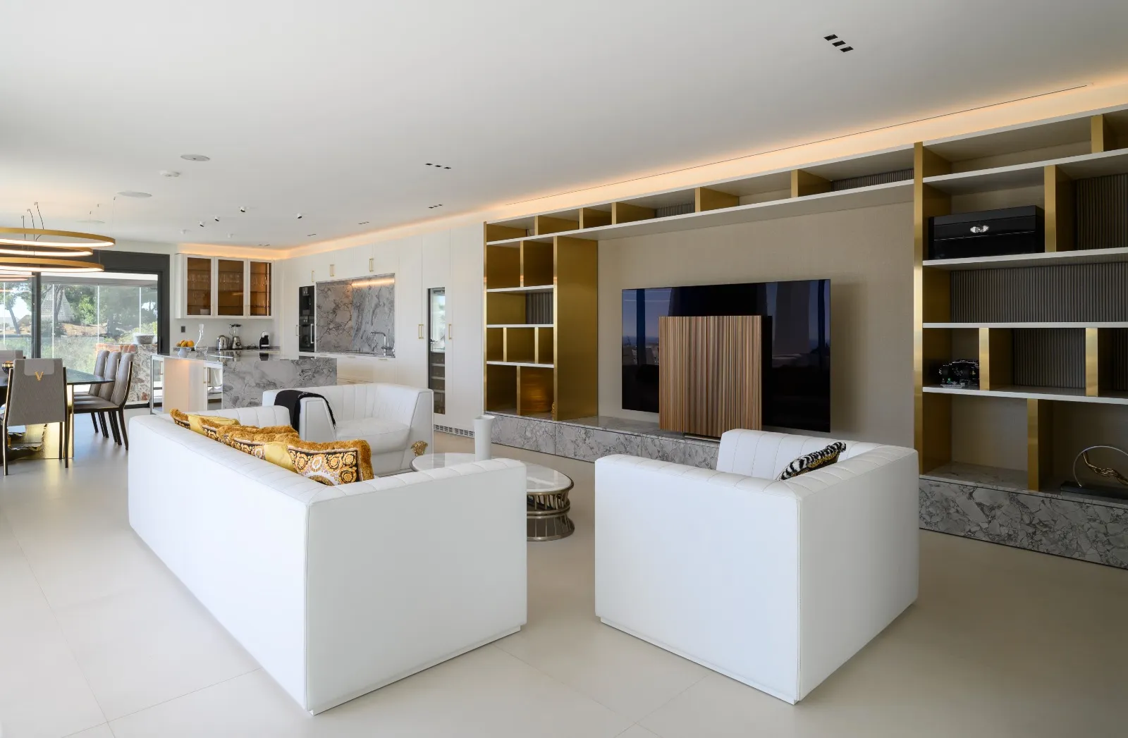 Diseño con personalidad, cambiante según los espacios interiores y sus funcionalidades, en dónde por momentos busca el contraste entre los mismos para que la decoración no pase desapercibida. Desde la entrada con mosaico de piedra natural italiano hasta los baños con piezas de gran formato, las mejores griferías y sanitarios del mercado y la iluminación de destaque, hacen que cada espacio sea una experiencia distinta. La piscina, sus espacios exteriores y sus espectaculares vistas al Mar Mediterráneo generan que esta casa, sea única por dónde se mire.